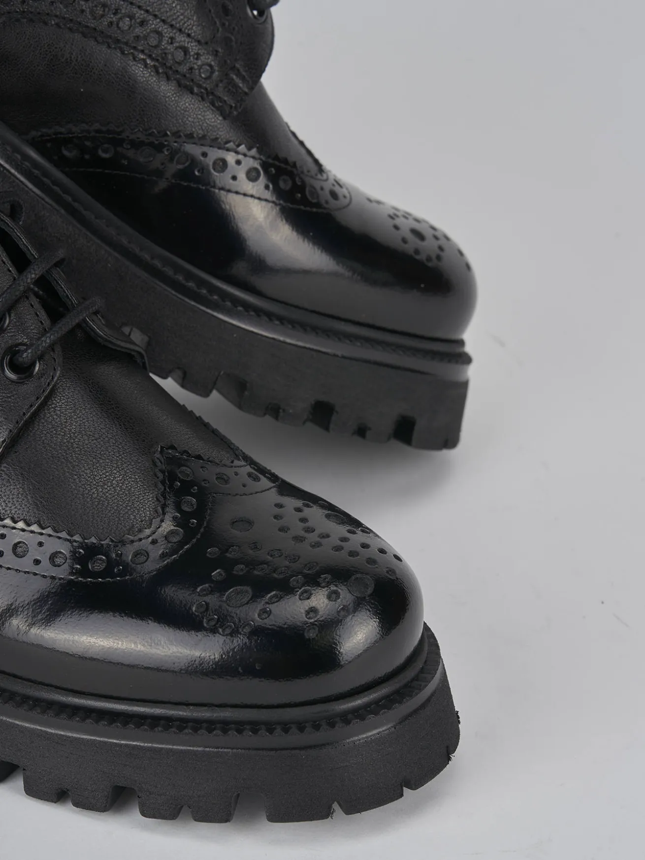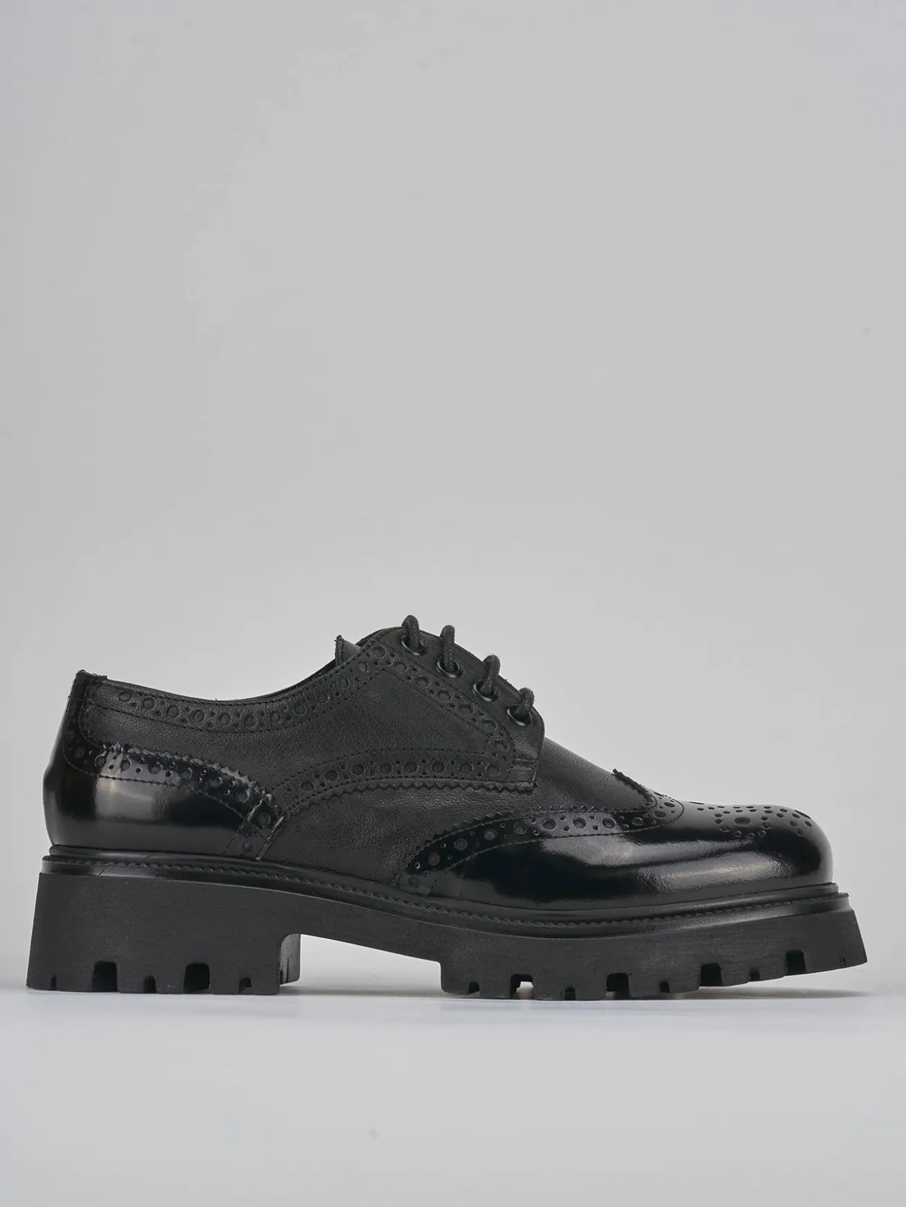 Stringata tacco 2 cm fondo in gomma e soletto interno in vera pelle. Tomaia in pelle di ottima qualità con pregiata lavorazione inglese e combinazione di due pellami differenti, rock raffinato e particolare fondo seghettato extra light per un look chic.