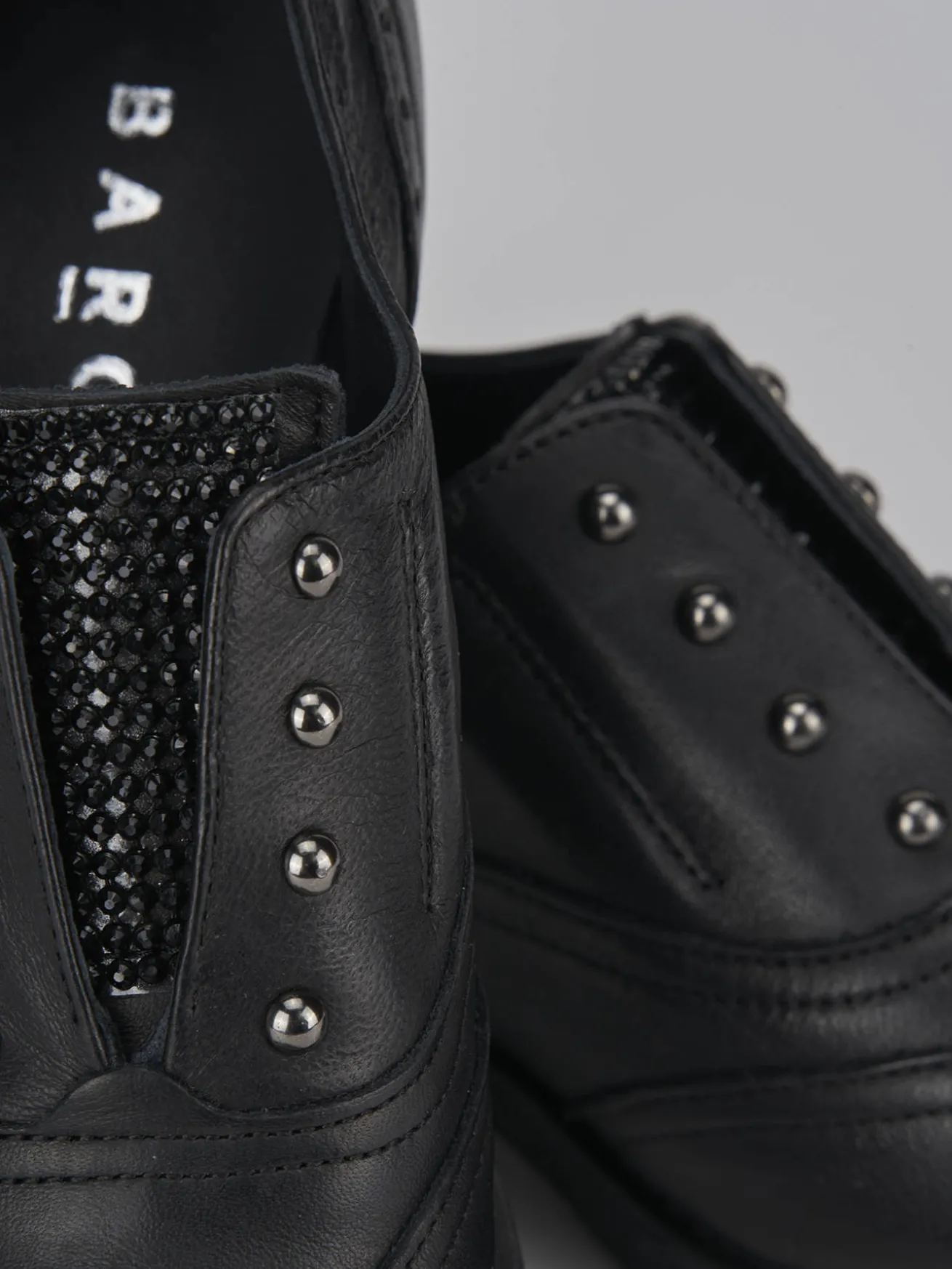 Stringata tacco 2 cm fondo in gomma e soletto interno in vera pelle. Tomaia in morbida pelle, punta tonda, cuciture raffinate e linguetta decorata con strass e borchiette per un look chic. Finta allacciatura con elastico interno.