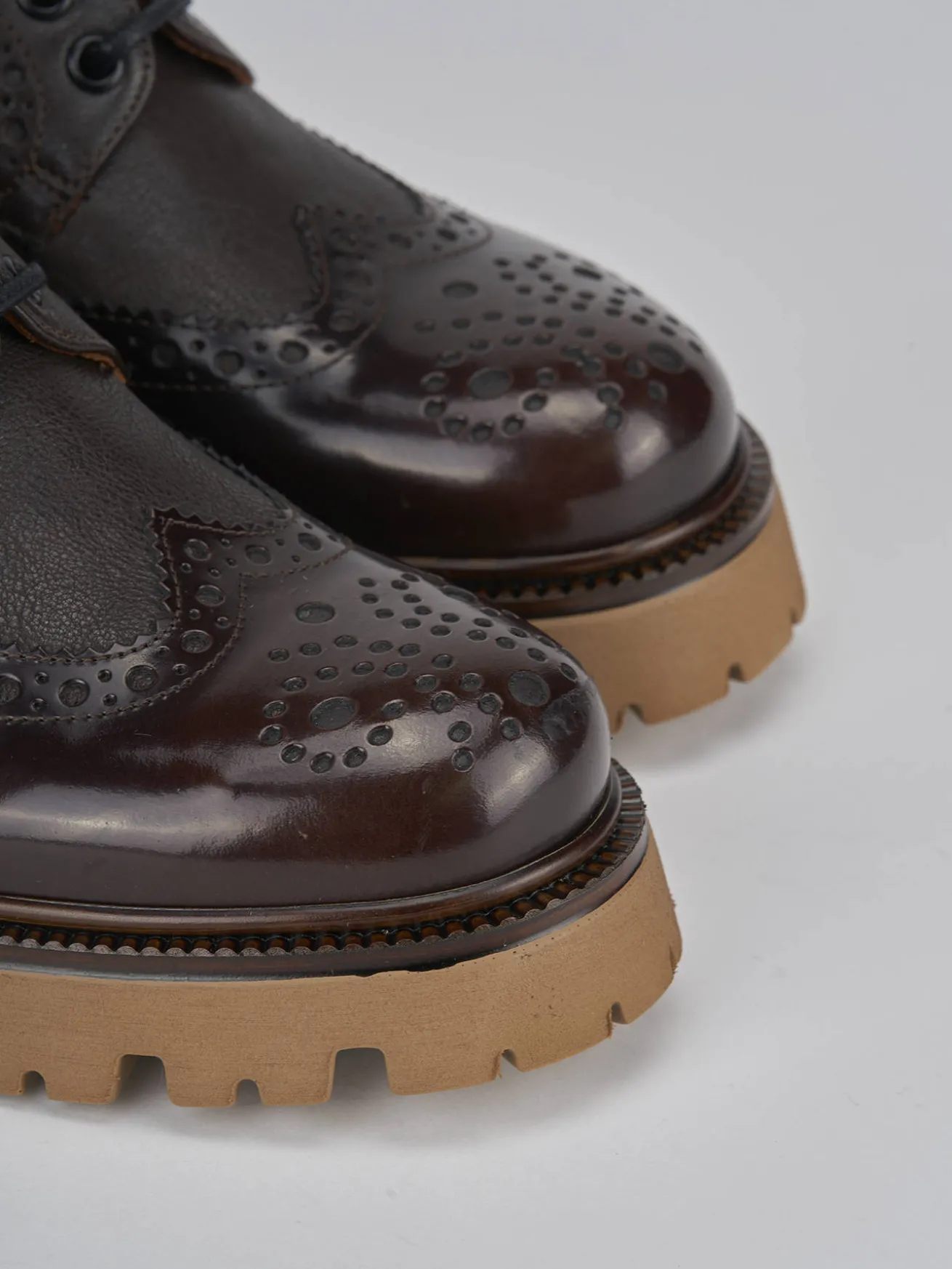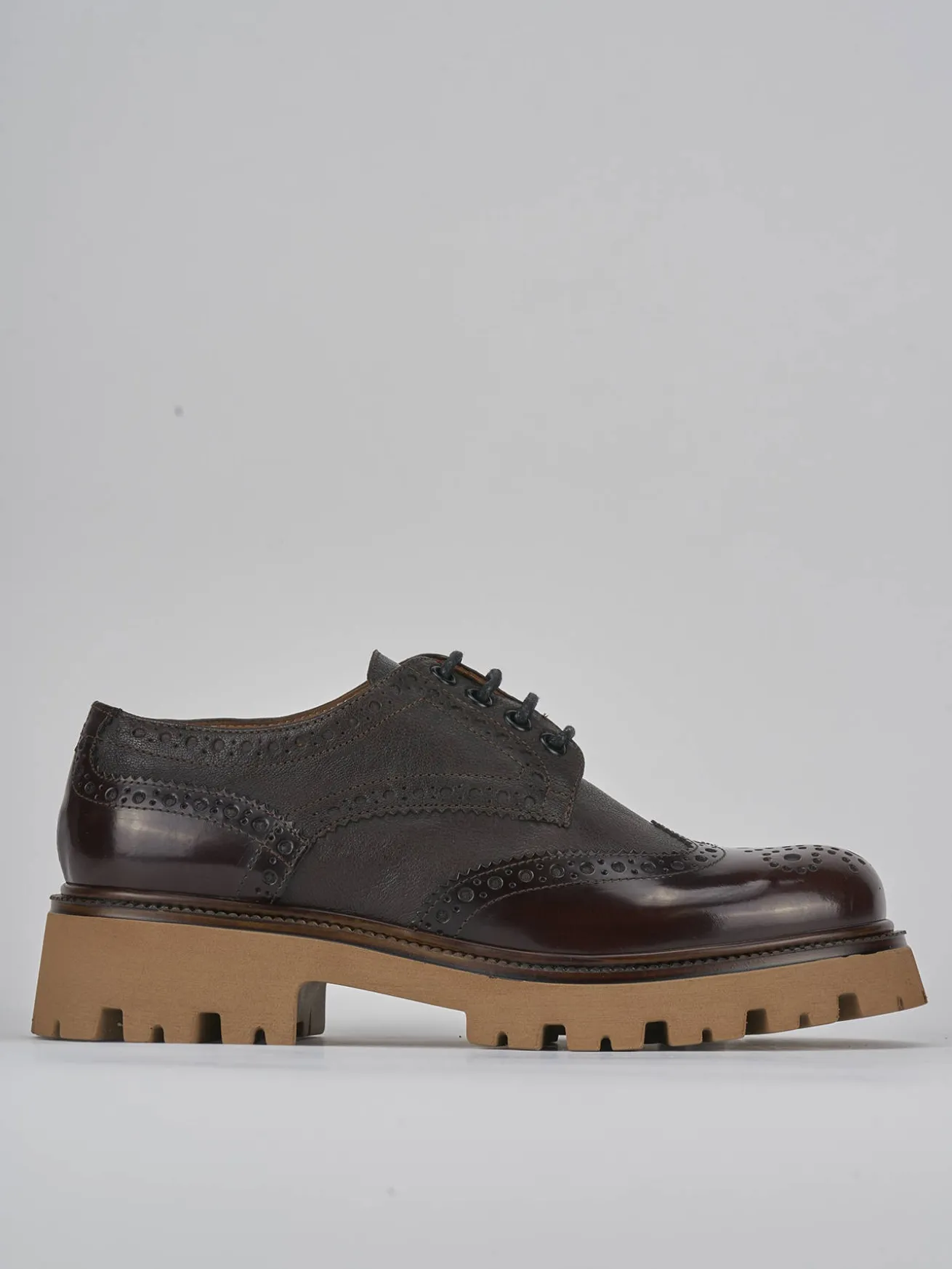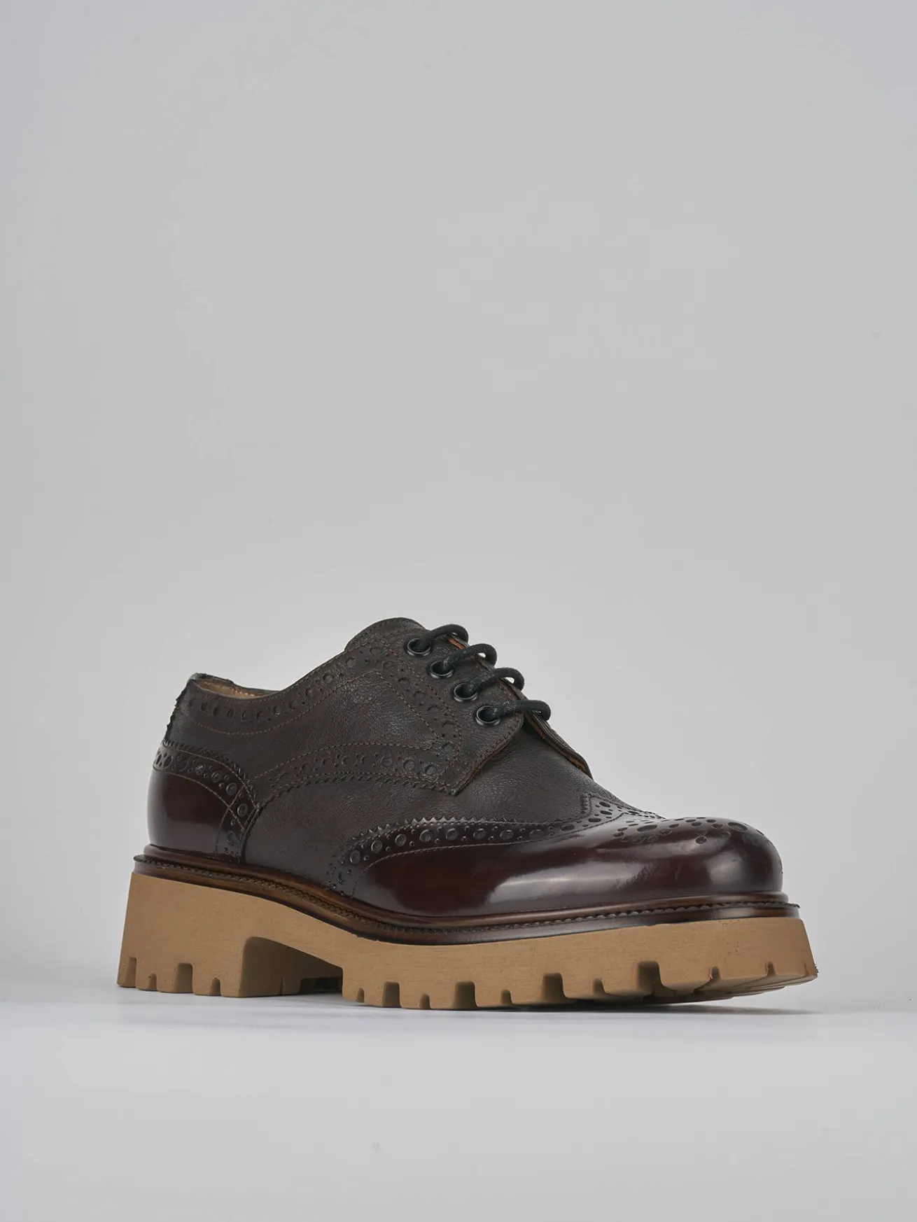 Stringata tacco 2 cm fondo in gomma e soletto interno in vera pelle. Tomaia in pelle di ottima qualità con pregiata lavorazione inglese e combinazione di due pellami differenti, rock raffinato e particolare fondo seghettato extra light per un look chic.